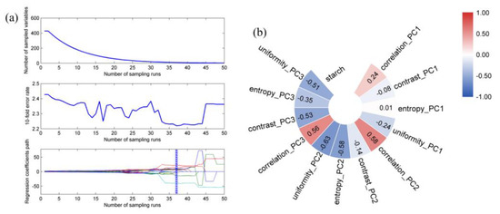 (a) Results of CARS method for wavelength selection; (b) correlation plot between textural variables and measured starch content.