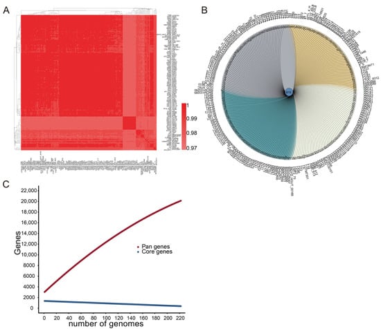 2.2. Average Nucleotide Identity Values, Pan-, and Core-Genome, and Phylogenetic Analyses