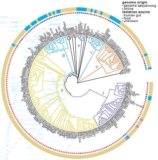 Phylogenetic analysis of 224 L. fermentum isolated from human intestinal tract and food based on 615 orthologous genes (All strains mainly clustered into phylogenetic clade I, II, III, IV, V, and VI). The genome origin is annotated with orange and blue circles and the isolation source of L. fermentum strains is notated with yellow, blue, and purple stripes.