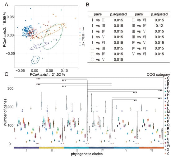 Clusters of orthologous groups (COGs) in the genome L. fermentum strains distributed in phylogenetic clades Ⅰ, Ⅱ, Ⅲ, Ⅳ, Ⅴ, and Ⅵ separately. (A) Principal coordinates analysis (PCoA) of COGs in the genome of L. fermentum strains in 6 main phylogenetic clades; (B) PERMANOVA and pairwise comparison analysis COGs in the genome of L. fermentum strains in 6 phylogenetic clades; (C) the violin plots show the number of genes annotated with diverse COG functional categories in L. fermentum in the phylogenetic clades Ⅰ, Ⅱ, Ⅲ, Ⅳ, Ⅴ, and Ⅵ and * indicate a significant difference in functional categories X between different group (** p < 0.01, *** p < 0.001).