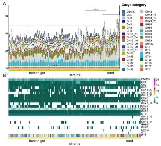 Genes encoding carbohydrate-active enzymes (CAZy) in the genome of L. fermentum strains isolated from human gut and food. (A) Stacked bar chart of carbohydrate-active enzyme (CAZy) categories in the genome of L. fermentum derived from different sources and * indicate a significant difference in the number of CAZys between different group (*** p < 0.001); (B) heatmap of the number of specific CAZy categories in the genome of L. fermentum strains from human gut and food. (The items of CAZy category with LDA score greater than 2 using linear discriminant analysis effect size analysis are listed).