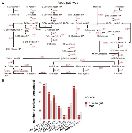 Metabolism of carbohydrates and related metabolic pathways of L. fermentum. (A) Schematic representation of CAZy in the metabolic pathway of the 224 L. fermentum strains. The solid lines indicate that more than 220 L. fermentum strains contained the enzyme. The dotted lines meant that the enzyme was present in fewer than 220 L. fermentum strains and the number of strains containing the enzyme is denoted by the dotted line; (B) number of genes encoding the enzymes (L-arabinose isomerase [EC: 5.3.1.4], araA; L-ribulose-5-phosphate 4-epimerase [EC: 5.1.3.4], araD; beta-glucosidase [EC: 3.2.1.21], bglX; oligo-1,6-glucosidase [EC: 3.2.1.10], malL; beta-galactosidase [EC: 3.2.1.23], lacZ; xylose isomerase [EC: 5.3.1.5], XylA; deoxyribose-phosphate aldolasebeta-glucosidase [EC: 4.1.2.4], deoC; phosphopentomutase [EC: 5.4.2.7], deoB) in the genome of L. fermentum strains from different sources.