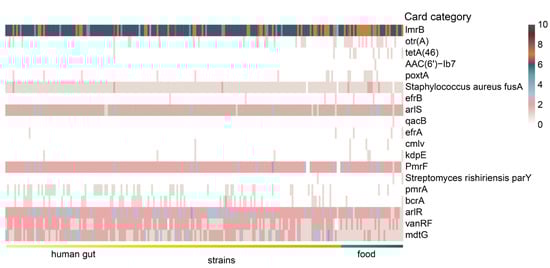 The genomes of 224 L. fermentum strains were annotated using the Comprehensive Antibiotic Resistance Database (CARD) and a total of 58 antibiotic resistance gene categories were found in the genomes of 224 L. fermentum strains. Based on LEfSe analysis with a Kruskal–Wallis test, 19 significantly different antibiotic resistance gene families were shown in Figure 6. Of note, antibiotic resistance gene family otr(A) (tetracycline antibiotic) and tetA(46) (tetracycline antibiotic) were almost exclusively found in food source L. fermentum strains. Number of genes belonging to card category lmrB (lincosamide antibiotic), poxtA (tetracycline antibiotic, phenicol antibiotic, and oxazolidinone antibiotic), and efrB (fluoroquinolone antibiotic, rifamycin antibiotic, macrolide antibiotic) were also dominant in L. fermentum strains in food. For human-derived L. fermentum strains, antibiotic resistance gene family pmrA (fluoroquinolone antibiotic), bcrA (peptide antibiotic), arlR (fluoroquinolone antibiotic), vanRF (glycopeptide antibiotic), and mdtG (phosphonic acid antibiotic) were all more abundant.