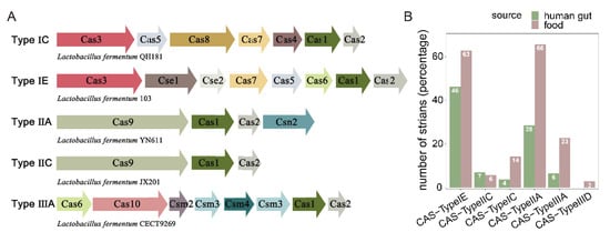 Clustered regularly interspaced short palindromic repeats (CRISPRs)/Cas system in L. fermentum. (A) Represent systems (Type IC, Type IE, Type IIA, Type IIC and Type IIIA) of Cas genes were listed; (B) distribution of CRISPR–Cas systems among strains of L. fermentum isolated from human gut and food.