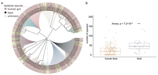 Distribution of the genome-targeting sequences in L. fermentum. (A) Phylogenetic analysis of spacer sequences in the genome of L. fermentum strains from human gut and food (Strains in the phylogenetic tree annotated with various leaf background colors correspond to different sources marked by stars in three different colors); (B) box plot showed the number of spacers in the genome of L. fermentum strains from two separate sources and * indicate a significant difference in the number of spacers between different group (*** p < 0.001).