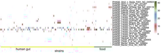 The number of prophages in L. fermentum strains predicted to be “intact” using PHASTER are shown in Figure 9. PHAGE_Lactob_LfeSau and PHAGE_Lactob_LF1 were the most abundant prophages in all L. fermentum strains and food source L. fermentum contained more abundant PHAGE_Staphy_SPbeta_like. Furthermore, less common prophages such as PHAGE_Paenib_Xenia, PHAGE_Lactob_phiPYB5, and PHAGE_Lactob_phig1e were distributed sporadically in L. fermentum of both sources. PHAGE_Lactob_JCL1032 and PHAGE_Lactob_521B were found only in “human gut source” L. fermentum strains.