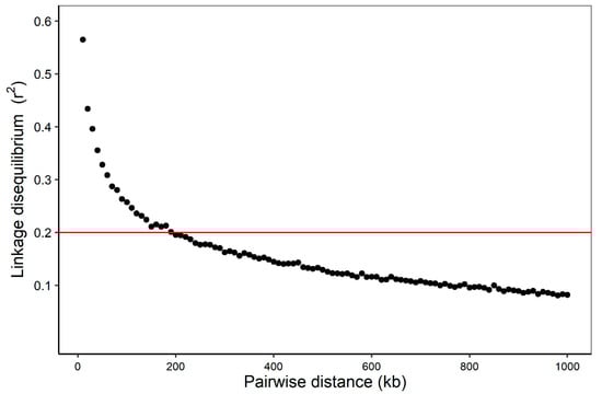 Linkage disequilibrium decay across the whole genome of the association panel. The red line represents the linkage disequilibrium threshold for the association panel (r2 = 0.2).