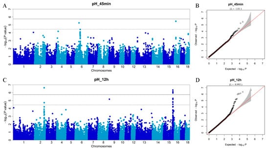Manhattan plots of the GWAS and Q–Q plots for meat pH traits. (A) GWAS for pH_45min; (B) Q–Q plot for pH_45min; (C) GWAS for pH_12h; (D) Q–Q plot for pH_12h. The x-axis represents the chromosomes, and the y-axis represents the −log10 (p-value).