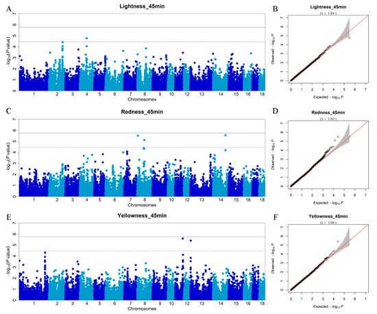 Manhattan plots of the GWAS and Q–Q plots for meat color traits (45 min). (A) GWAS for L*_45min (lightness_45min); (B) Q–Q plot for L*_45min (lightness_45min); (C) GWAS for a*_45min (redness_45min); (D) Q–Q plot for a*_45min (redness_45min); (E) GWAS for b*_45min (yellowness_45min); (F) Q–Q plot for b*_45min (yellowness_45min). The x-axis represents the chromosomes, and the y-axis represents the −log10 (p-value).