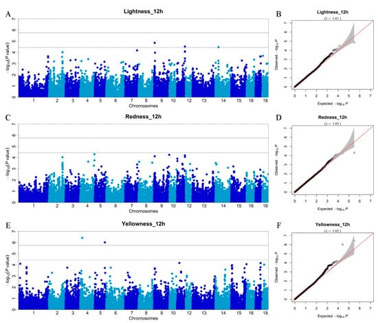 Manhattan plots of the GWAS and Q–Q plots for meat color traits (12 h). (A) GWAS for L*_12h (lightness_12h); (B) Q–Q plot for L*_12h (lightness_12h); (C) GWAS for a*_12h (redness_12h); (D) Q–Q plot for a*_12h (redness_12h; (E) GWAS for b*_12h (yellowness_12h); (F) Q–Q plot for b*_12h (yellowness_12h). The x-axis represents the chromosomes, and the y-axis represents the -log10 (p-value).