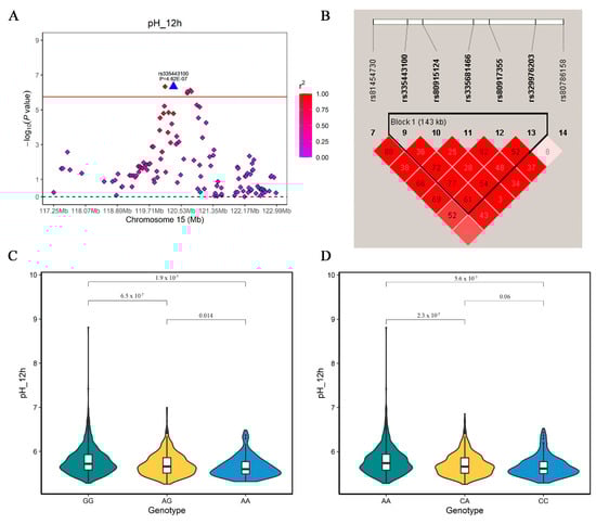 (A) Regional plots of rs335443100 at 117.25–122.99 Mb on SSC15 for meat pH_12h in DLY pigs. (B) represents the 143 kb linkage disequilibrium block in the significant region on SSC15. (C) Violin plot showing the differences in meat pH among three genotypes of the GWAS top SNP (rs335443100). (D) Violin plot showing the differences in meat pH among three genotypes of the SNP explaining the most phenotypic variance within TTLL4 gene.