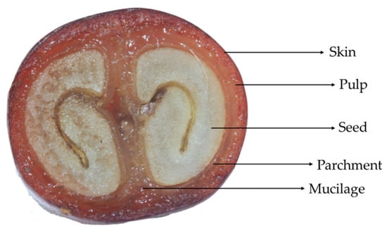 Several steps are involved in coffee production. After the fruits are harvested, they may undergo different types of processing to release the seeds that are traditionally roasted and ground for the coffee beverage extraction. While in the wet postharvest processing the skin and pulp are fermented or enzymatically digested to release the seeds, in the dry and semi-dry processing, they are mechanically separated from the seeds after washing and drying [2]. The coffee pulp alone corresponds to approximately 28% of the coffee fruit on a dry weight basis, the skin approximately 12%, and the seeds 50–55% [3] (Figure 1).