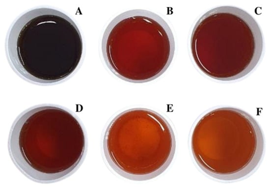 Infusions of commercial coffee cascara teas from Latin American countries. (A): sample 3—El Salvador (F); (B): sample 1—Brazil (F); (C): sample 4—Nicaragua (F); (D): sample 5—Brazil (UF); (E): sample 6—Nicaragua (UF); (F): sample 2—Bolivia (F). Note: F–fermented; UF—unfermented.
