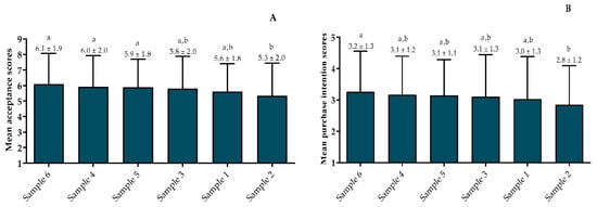 Mean acceptance (A) and purchase intention (B) scores given for coffee cascara infusions by Brazilian consumers living in Rio de Janeiro. Different letters over the bars indicate statistical differences among samples by ANOVA (p ≤ 0.05) (n = 100 assessors). Samples: 1—Brazil (F); 2—Bolivia (F); 3—El Salvador (F); 4—Nicaragua (F); 5—Brazil (UF); 6—Nicaragua (UF). F—fermented; UF—Unfermented.