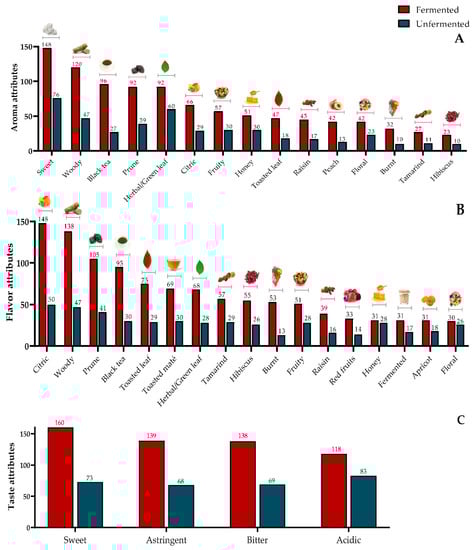 The aroma, flavor and taste of coffee cascara tea vary considerably and are not easy to reproduce, as they depend not only on genetics but also on the terroir, edaphoclimatic conditions and the postharvest processing method applied, including fermentation [2]. The perceived intensity and the number of assessors who perceived the attributes also varied among samples. However, considering the number of volatile compounds commonly identified in the unfermented and or fermented samples, that 26 attributes were frequently checked for all samples and that most volatile compounds identified in this study were also reported by Pua et al. [44], it appears that the volatile profiles presented in this study can characterize coffee cascara teas generically. Nonetheless, it is expected that the cascara teas will most often show unique profiles depending on the conditions aforementioned.
