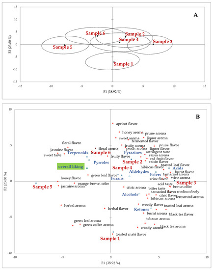 Principal component analysis (PCA): bi-dimensional plot of samples of cascara coffee tea infusions (n = 6) (A) and sensory characteristics attributed by consumers (n = 100) through RATA sensory test, distributing volatile compounds and attributes that make up the best acceptance of samples among consumers (B). Overall liking and the volatile compounds were considered as supplementary variables. Samples: 1—Brazilfermented (F); 2—Bolivia (F); 3—El Salvador (F); 4—Nicaragua (F); 5—Brazilunfermented (UF); 6—Nicaragua (UF).