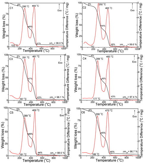 The endothermic effect between 122 and 186 °C was attributed to the drying of coffee powders and the desorption of physically absorbed water molecules (dehydration). The broad exothermic effect that appeared in the range of 289–292 °C on the DTA curves was ascribed to polysaccharide and lipid decomposition, while the second wide exothermic effect on the DTA curve, present for all samples at 461–483 °C (air) and 369–376 °C (argon), was attributed to the decomposition of amino acids and proteins [27].