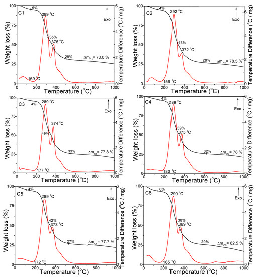 TG (black line) and DTA (red line) curves of the coffee samples under air atmosphere.
