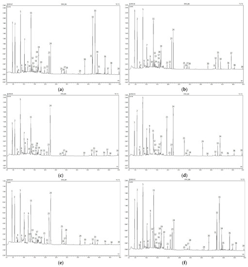 Total ion chromatograms of volatile organic compounds identified in coffee samples by HS-SPME-GC-MS analysis: (a) C1; (b) C2; (c) C3; (d) C4; (e) C5; and (f) C6.