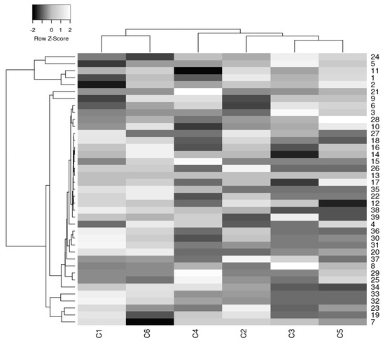 Hierarchical cluster analysis through heatmapping (Figure 4) was conducted to find the inter-connectivity and closeness of the studied coffee samples and individual volatile organic compounds. Heatmap representation clearly showed differentiation with respect to the volatile aromatic-compound profiles of the samples. At the same time, the hierarchical clustering indicated that C1 and C6 samples (dark-roasted Arabica varieties) were distributed separately and fell aside from the heatmap compared with the other samples (medium-roasted Arabica, Robusta, and their mixtures).