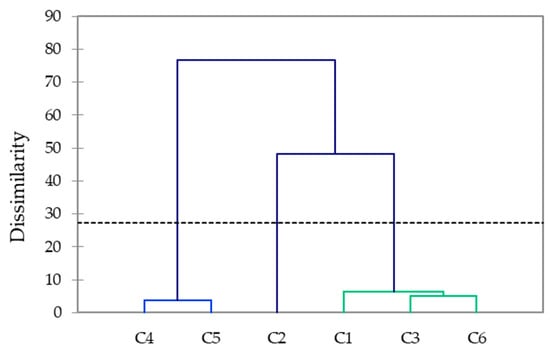 Based on the elemental compositions and polyphenol contents, AHC (Figure 5) grouped the coffee beans into three clusters. The first cluster included the moderate-roast Arabica beans (C4, C5), the second cluster contained the intense-roast Robusta beans (C1), and the third cluster encompassed the intense-roast Arabica and Arabica–Robusta mixtures (C1, C3, C6).