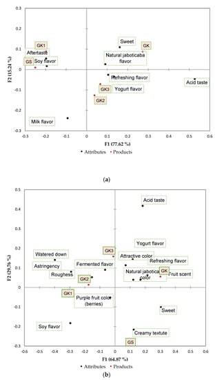Multiple correspondence analyses showed that the first and second dimensions explain 92.86% of the variance of the experiment at T0 (Figure 1a). The statistical test uses only the most frequently cited attributes since those with a low frequency can lead to false results []. The formulations were positioned in three different groups and obtained good attribute separation among the three quadrants. GS and GK1 were characterized by an aftertaste and a soy flavor, GK3 by a refreshing flavor and yogurt flavor, and GK2 did not obtain any relationship with the descriptor terms. The GK formulation, which exhibited the highest absolute mean for the flavor attribute, was characterized by a sweet and natural jaboticaba flavor, evidencing the impact of these characteristics on the product consumer. At T90 (Figure 1b), the first and second dimensions explained 94.62% of the variation between samples. The ice creams were positioned in four different quadrants and characterized by different attributes. The attribute that best described the GS formulation was a creamy texture; GK1 and GK2 were characterized by a purple fruit color (berries) and GK3 by a fermented flavor. Once again, the formulation with 100% kefir (GK) presented a distinct sensory profile, being associated with pleasant attributes such as a fruit aroma, refreshing flavor, natural jaboticaba flavor, attractive color and yogurt flavor.
