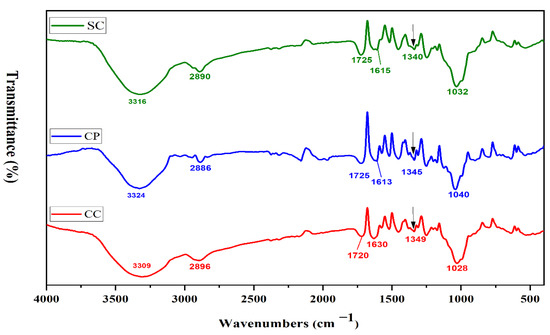 FTIR analysis was also employed to confirm the presence of CC, CP and SC biomass components such as lignin, cellulose and hemicellulose. The FTIR spectra of CC, CP and SC biomasses are shown in Figure 1. The presence of cellulose, hemicelluloses and lignin (phenolic+CH2OH) was confirmed by the bands 3309–3324 cm−1, corresponding to -OH axial deformation and intermolecular hydrogen-bonded H–O–H stretching [51]. Moreover, the deconvolution of broad bands in the 3500–3300 cm−1 range was performed to show the differences in hydrogen interactions (Figure S1 and Table S1). The analysis showed that SC biomass had a strong hydrogen bonding interaction (higher intensity), followed by CP biomass, while CC biomass had the lowest density of hydrogen bonding. The fitted peaks centred at 3460–3480 cm−1 are assigned to H-bonded -OH group (intermolecular H- bonds) [52]. The characteristic spectral band of lignin assigned to the skeleton vibrations in the phenolic ring (vC=C) at 1517 cm−1 was detected [53,54]. The hemicellulose bands at 1173 cm−1 referred to acetate groups.