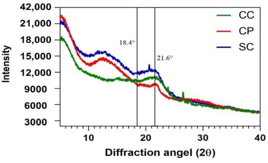 Generally, cellulose molecules have both amorphous and crystalline regions, while lignin and hemicellulose only contain amorphous areas. XRD can examine the crystal structure of cellulose and conclude the CrI (%) [54]. Crystallinity is considered the percentage of an ordered crystalline structure in a material. The CrI (%) is related to cellulose, as lignin and hemicellulose only have amorphous structures [58]. XRD analysis of lignocellulosic biomass is challenging because this method measures the crystalline materials’ crystal structure. Notwithstanding, the lignocellulosic material has a complex structure with a high percentage of amorphous structures. Materials with high amorphous contributions exhibit a huge background signal, superimposing the crystalline regions’ clear signals; this phenomenon was observed in our XRD results (Figure 2). As shown in Figure 2, SC and CC biomasses had similar crystalline peaks at 21.5° 2θ, while CP had a wide, non-sharp peak at 21.5°. It was also found that CC had significantly higher CrI (%) compared to SC and CP biomasses (Table 1). These findings were matched with crystallinity properties confirmed by TCI results from FTIR analysis (Table 1). Thus, it could be concluded that the cellulose of CC biomass has more crystalline regions in its structure compared to the cellulose structure of CP and SC.