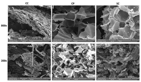 The SEM micrographs of lignocellulosic biomasses; including corn cob (CC), cornstalk piths (CP) and sugarcane bagasse (SC).
