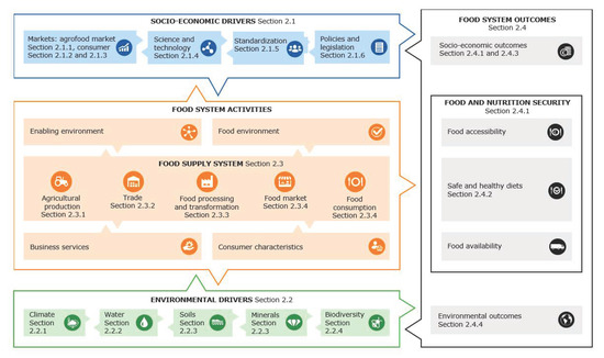 The food system approach was formulated as a method to oversee the complexity of the entire food system, not merely limited to the food supply chain and its actors, but also taking into account the socioeconomic and environmental drivers which influence the food supply chain [3]. Furthermore, it also serves as a tool to oversee the outcomes of the food system with respect to its impacts on food security, health, socioeconomic and environmental aspects. Hence, this methodology is widely accepted and adopted as a logical framework to analyze the entire food system.