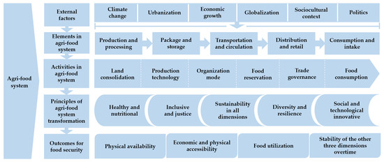 Food security itself is a multi-dimensional concept, with goals ranging from ensuring survival and health to gradually considering food preferences, involving food accessibility, availability, utilization, and stability [11], and it operates within social, economic, environmental, and political contexts [12]. It is inconclusive how analysts should rank the various indicators that influence food security [13], which can only be achieved when the specific objective is clearly stated [14]. It will be more valuable for policy guidance to identify clearly with food security’s meaning, limitations, and interaction approaches with non-food factors, from a systematic perspective [15]. Globally, the in-depth structural transformation of agri-food systems is expected to be achieved in the future in a more inclusive way [1], i.e., delivering healthy food for human beings, and that it should be resilient to shocks from climate change, economic risk, and market failures [16].