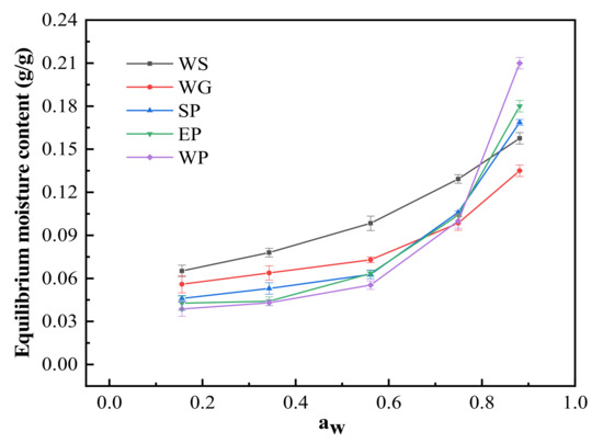 3.1. Moisture Adsorption Isotherms of WS and Proteins