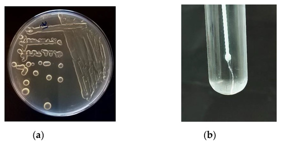 Characteristics of EPS produced by LAB: (a) Mucoid colonies—slimy phenotype; (b) Ropy phenotype.