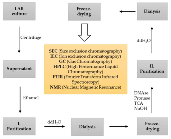 Quantitative evaluation of EPS produced by LAB requires extraction from the culture media or food matrices. Extraction of EPS involves several steps, including centrifugation to recover the EPS-containing supernatant, addition of acid (e.g., TCA) to remove the high protein content, and precipitation with cold ethanol (Figure 2). The precipitated EPS is then collected and dissolved in water before membrane filtration (usually dialysis or ultrafiltration) to remove the small neutral sugars, salts, and small proteins [19,113,114,115,116]. Finally, the dialyzed EPS solution is freeze-dried to obtain a pure EPS solid, which has a white color and a soft, spongy texture (Figure 2). In this step, the weight of the obtained EPS gives an approximate indication of the EPS yield [117]. Colorimetric methods such as the phenol-sulfuric acid method [118] or the sulfuric acid-UV method, which is more accurate and faster, are usually used to quantify the EPS [119]. Sometimes a second purification step is required to ensure the high purity of EPS [110]. This may involve treatment with proteases and nucleases to remove contaminating proteins and DNA. In addition, anion exchange chromatography and/or size exclusion chromatography are recommended as they contribute to high-purity samples [120]. The number of steps used for EPS isolation depends on the complexity of the media used for production and the type of EPS (HoPS or HePS). Therefore, a prior study is essential to optimize and improve the fermentation conditions.