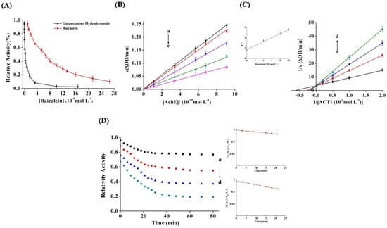 (A) Effect of baicalein and galantamine hydrobromide on the activity of AChE at 25 °C (pH 7.6); c(AChE) = 0.57 nM, c(ACTI) = 0.25 mM. (B) Plots of v versus (AChE). c(ACTI) = 0.25 mM and c (baicalein) = 0, 2, 4, 8, and 16 µM for curves a→e, respectively. (C) Lineweaver–Burk curve of baicalein, c(AChE) = 0.57 nM; c (baicalein) = 0, 4, 8, and 10 µM for curves a→d. (D) Time course for the relative activity of AChE in the presence of baicalein at the concentrations of 2, 4, 8, and 16 μM for curves a→d, respectively. c(AChE) = 0.57 nM and c(ACTI) = 0.25 mM. Semilogarithmic plot analysis for baicalein at 2 μM (the upper-right panel) and 16 μM (the lower-right panel), and the slope of the curves suggests the inactivation rate constants.