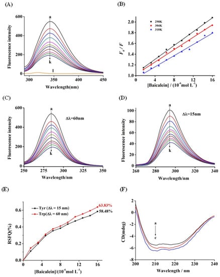 For the investigation of AChE-related conformational changes, synchronous fluorescence spectroscopy is used. The fluorescence spectra between 15 and 60 nm at the wavelength interval (Δλ) indicate the fluorescence characteristics for Tyr and Trp residues and can reveal the microenvironment information of the proteases. As shown in Figure 3C,D, the increase in baicalein concentration resulted in the bathochromic shifts from 294 to 295 nm for Tyr residues and 285 to 287 nm for Trp residues of AChE. The findings indicate that the hydrophobicity of Tyr and Trp residues in the milieu was increased and that baicalein triggered a conformational change in AChE and influenced the microenvironment for amino acid residues. Tyr and Trp residues were contrasted in contribution based on their ratios in synchronous fluorescence quenching (RSFQ = 1 − F/F0). With an increase in the concentration of baicalein, the RSFQ value for Trp residues reached 63.83%, which was higher than that for Tyr residues (58.48%) (Figure 3E). The current finding implies that the Trp residue contributed more to the interplay between baicalein and AChE than the Tyr residue because Trp residue was closer to the binding site and had more substantial binding power with baicalein [].