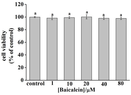 The cytotoxicity of baicalein in PC12 cells. Data are presented as the mean ± SEM of six independent experiments. The same letter “a” indicates no significant difference (p > 0.05).