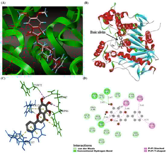 Baicalein (5,6,7-trihydroxyflavone, as shown in Figure 1A) is an effective active component monomer of flavonoids extracted from the root of Scutellaria baicalensis Georgi [], and it exerts numerous pharmacological effects, including antioxidant [], scavenging oxygen free radicals [], anti-inflammatory [], antimicrobial [], anti-carcinogenic [] and neuroprotective effects []. The effects of baicalein on alleviating AD and improving cognition and brain protection have been reported [,,]. Baicalein can activate the PI3K pathway, inhibit the levels of GSK3β and BACE1, reduce the content of total Aβ, and play a neuroprotective role in mice, thereby enhancing memory []. Wei [] confirmed that baicalein can effectively alleviate cognitive impairment induced by Aβ 1-40 in rats and change the protein expression level in the cerebral cortex and hippocampus. Studies by Han [] and other scholars have shown that baicalein is a selective and specific inhibitor of BACE and AChE that can be utilised to prevent and treat AD. Xie [] investigated the inhibitory effect of 20 flavonoids on AChE and explored their structure−activity relationship in the preliminary stages. However, the detailed molecular mechanism of baicalein against AChE is yet to be explored.