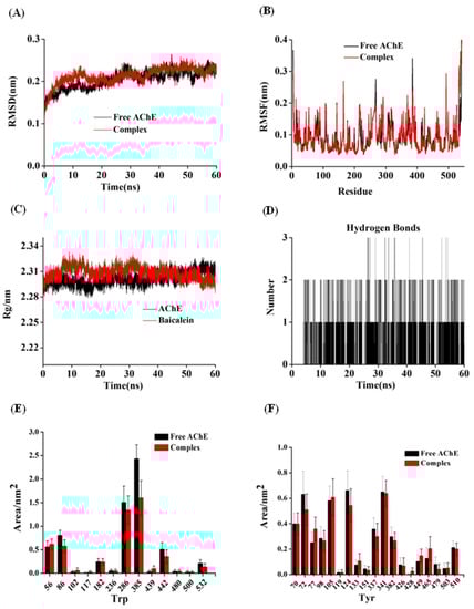 M.D. simulation of baicalein with AChE for 60 ns. The RMSD (A) and RMSF (B) plots, and Rg values (C) of the baicalein–AChE complex and free AChE backbone. (D) The number of hydrogen bonds between baicalein with AChE during simulation. The SASA values of the residues Trp (E) and Tyr (F).