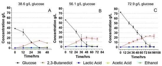 Due to the dilution effects of adding nutrient solutions and culture inoculum to the media, the actual initial glucose concentrations were 38.6, 56.1, and 72.9 g/L, respectively, as measured by HPLC. For the fermentation with an initial glucose concentration of 38.6 g/L (Figure 1A), it took 36 h for B. licheniformis YNP5-TSU to consume all glucose with the highest 2,3-BDO titer of 14.3 g/L and the corresponding 2,3-BDO yield of 0.37 g/g. However, after 36 h when all glucose was consumed, the YNP5-TSU started to consume the produced 2,3-BDO and produced 2.79 g/L acetic acid at 48 h. The conversion of 2,3-BDO into acetic acid after the sugar depletion was also reported by the studies of O‘Hair et al. (2020) and Wang et al. (2003) [14,29], who stated that the 2,3-BDO is most likely converted to acetyl-CoA through reversible pathways, generating acetic acid. Lactic acid and ethanol remained at low levels (<0.7 g/L) throughout the 48 h fermentation, indicating the high specificity of B. licheniformis YNP5-TSU to produce 2,3-BDO as the dominant end-product.