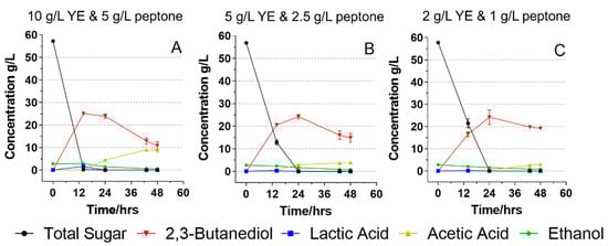 Fermentation of B. licheniformis YNP5-TSU using glucose fermentation media (60 g/L) with three different yeast extract and peptone concentrations—10 g/L yeast extract and 5 g/L peptone (A); 5 g/L yeast extract and 2.5 g/L peptone (B); 2 g/L yeast extract and 1 g/L peptone (C). YE: yeast extract.