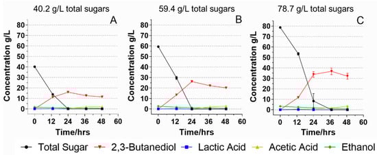 Increasing the substrate (sugar) loading has a profoundly positive economic impact on 2,3-BDO fermentation, such as reduced equipment size and decreased energy consumption for downstream distillation [4]. Therefore, food waste hydrolysates with three different initial sugar concentrations were prepared to study how different initial total sugar concentrations affect the 2,3-BDO fermentation. The initial sugar concentrations were 40.2, 59.4, and 78.7 g/L, respectively. All food waste hydrolysates were supplemented with minimal nitrogen nutrients: 2 g/L of yeast extract and 1 g/L of peptone. When the initial sugar concentration was 40.2 g/L, it took 24 h for B. licheniformis YNP5-TSU to consume all sugars and produce 15.9 g/L 2,3-BDO with a yield of 0.40 g/g (Figure 4A). When the initial sugar increased to 59.4 g/L, the B. licheniformis YNP5-TSU was still able to utilize all sugars within 24 h with 26.1 g/L 2,3-BDO produced and an improved yield of 0.44 g/g (Figure 4B).