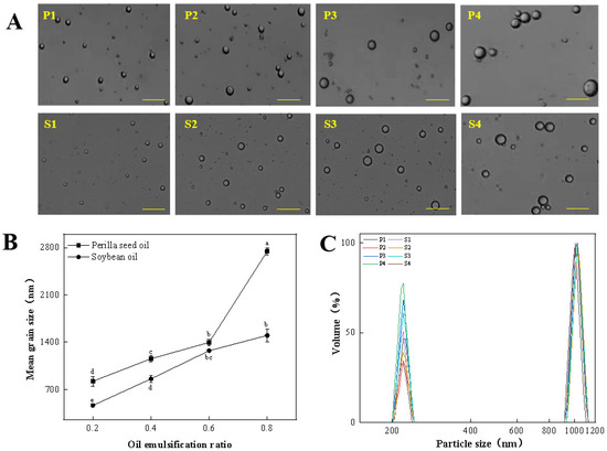 The droplet diameter (A), mean grain size (B) and particle size distribution (C) of perilla seed oil and soybean oil with the different emulsifying ratios (The measurement was done at backscatter angle of 173° and at room temperature, and the particle size and distribution were obtained using the built-in analytical software of Zetasizer Nano-ZS900 instrument). Scale bar: 100 μm. (Different little letters mean a significant difference at the level of 0.05, p < 0.05).