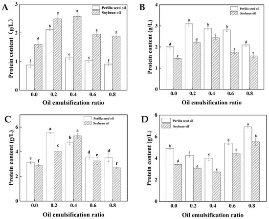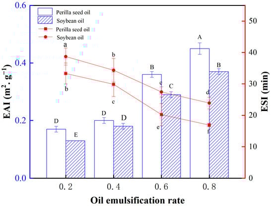 The EAI and ESI of perilla seed oil and soybean oil with the different emulsifying ratios. (Different capital letters or little letters mean a significant difference at the level of 0.05, p < 0.05).