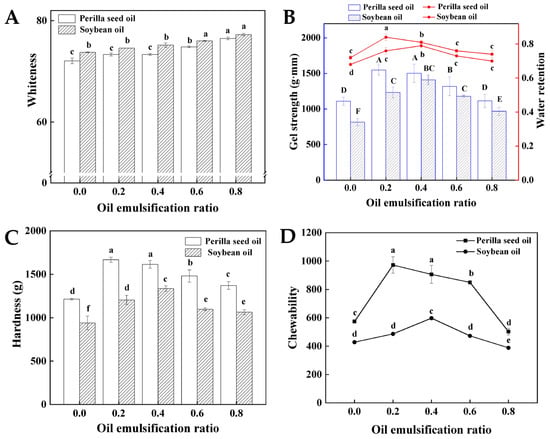 The gel properties of surimi gel emulsified by perilla seed oil and soybean oil subjected to heating treatments (A) whiteness, (B) gel strength and water retention, (C) hardness and (D) chewability. (Different capital letters or little letters mean a significant difference at the level of 0.05, p < 0.05).