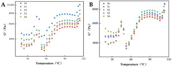 The dynamic temperature sweeps of surimi gel emulsified by perilla seed oil (A) and soybean oil (B).