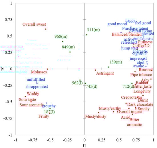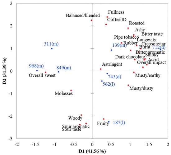 Principal component analysis (PCA) map of the sensory profiles of eight brewed black coffee.● = sensory attributes, ● = samples with roast level in parenthesis (l = light, m = medium and d = dark).