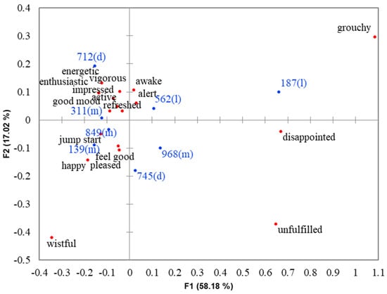 Results based on Cochran’s Q test revealed that differences existed across the eight coffee samples for 17 out of 20 emotion terms. The non-discriminating emotion terms were bored, joyful and relaxed. A symmetrical correspondence analysis (CA) map (Figure 2) shows the positioning of each coffee sample in the emotion space that explains 75.2% of total variability. The top three most liked samples (712, 139 and 311) were on the left quadrants and were explained by the emotion terms active, alert, awake, energetic, enthusiastic, feel good, good mood, happy, impressed, jump start, pleased, refreshed, vigorous and wistful. Next, on the right of these samples were samples 745, 968 and 562, which received liking scores in a neutral range. Although sample 849 was also rated in a neutral range for overall liking, its position in the CA map was closer to the top three most liked sample. By contrast, sample 187 that was disliked by consumers was on the right quadrant and was anchored by the terms disappointed, grouchy and unfulfilled. Results clearly showed that positive emotions were elicited by coffee samples that received liking scores in positive and neutral ranges of the scale, with generally higher frequency counts of positive emotions for liked samples than for neutrally liked samples, while negative emotions were evoked by disliked coffee samples. These results were supported by previous works on coffee [21,26,33] and other food categories, such as sweetener [49], salty snack, yogurt, cheese [29], beef [50] and fruit and vegetable juices [15,51] that samples with higher liking scores were more strongly associated with positive emotions, while less liked samples were more strongly associated with negative emotions.