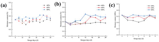 Changes in the rice moisture content at different storage temperatures: (a) 20 °C, (b) 30 °C, and (c) 35 °C.