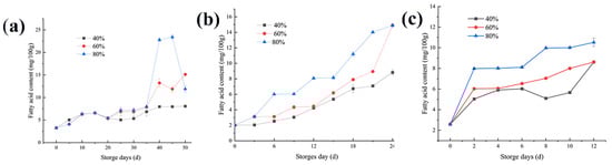 Changes in the rice fatty acid content at different storage temperatures: (a) 20 °C, (b) 30 °C, and (c) 35 °C.